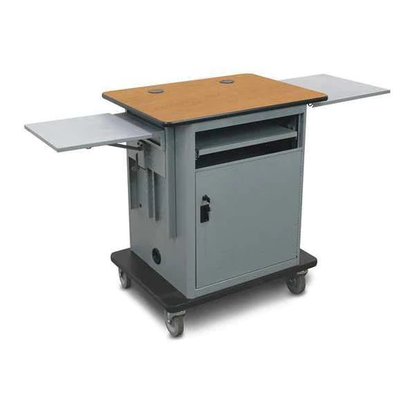 The Instructor Cart Series functions as a TeacherTMs Station, supporting both A/V and Desk functions on a small footprint. The œInstructor is designed to support todayTMs classroom needs and safety requirements. The 'Gold' cart has every feature an educator could want, in a classroom friendly size. Overall Cart Dimensions: 30"W x 22"D x 35.2"H No Tip Safety Base 30W x 22D High Pressure Laminate Worksurface with Wire Management Grommets Back Panel Access Door 16W x 13D x 2.5H Height Adjustable Locking Drawer Keyboard Shelf CPU Shelf with Safety Strap Includes UL Listed 8-Outlet Electrical Unit with Surge Protection and 20TM Power Cord 5 Diameter Non-Marring Ball Bearing Swivel Casters (2 Locking) Wire Handling Grommets on Each Side and Base Full Extension Ball Bearing Slides 10U Rack Rails 3„4 Height Locking Front Door 14W x 14.5D Adjustable Height Safety Slow Close Shelf featuring the FeatherTouch Lift System – Left Side. Adjusts from 24.5" – 34.5" from floor. Oversized 16W x 17.5D No Pinch Safety Slow Close Shelf – Right Side