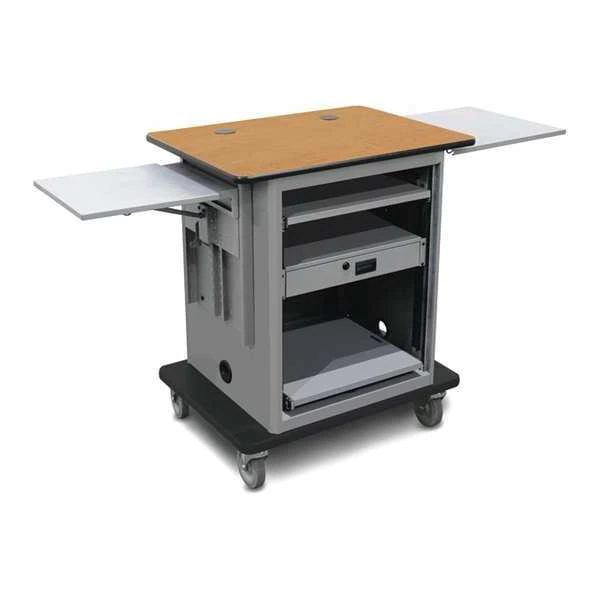 The Instructor Cart Series functions as a TeacherTMs Station, supporting both A/V and Desk functions on a small footprint. The œInstructor is designed to support todayTMs classroom needs and safety requirements. The 'Silver' level cart is feature rich, but doesn't include the locking door. This is ideal for secure environments. Overall Cart Dimensions: 30"W x 22"D x 35.2"H No Tip Safety Base 30W x 22D High Pressure Laminate Worksurface with Wire Management Grommets Back Panel Access Door 16W x 13D x 2.5H Height Adjustable Locking Drawer Keyboard Shelf CPU Shelf with Safety Strap Includes UL Listed 8-Outlet Electrical Unit with Surge Protection and 20TM Power Cord 5 Diameter Non-Marring Ball Bearing Swivel Casters (2 Locking) Wire Handling Grommets on Each Side and Base Full Extension Ball Bearing Slides 10U Rack Rails 14W x 14.5D Adjustable Height Safety Slow Close Shelf featuring the FeatherTouch Lift System – Left Side. Adjusts from 24.5" – 34.5" from floor. Oversized 16W x 17.5D No Pinch Safety Slow Close Shelf – Right Side