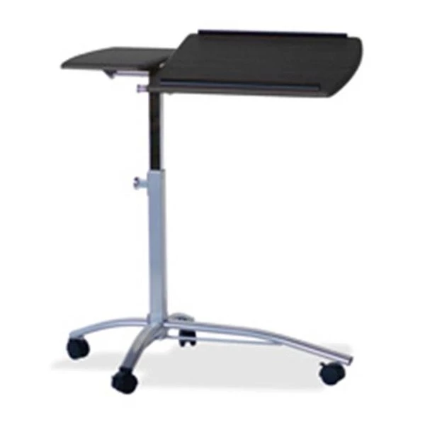 Laptop Caddy adjusts from 27" to 38" in height. Design features a steel frame and split top that tilts for ergonomic use. One section of the split top has paper stops on the bottom and top to rest laptops and documents. Laptop caddy is mobile on three locking casters.