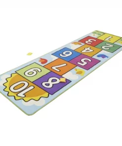 A classic game takes a leap forward with this colorful, high quality hopscotch game set! Featuring cheerful birds, fluffy clouds, and a rainbow of colors, this hopscotch rug offers lots of ways to learn and play! Reinforced border binding prevents fraying! 2 colorful beanbag play pieces included. Durable rug material is stain-resistant and washable. Skid-proof backing is safe on all floor surfaces and works for indoor and outdoor use. Rug dimensions are 78.5 x 26.5 inches.