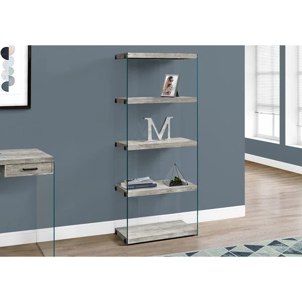 Spoil yourself with a chic tempered glass etagere that provides a perfect spot for candles, books, photo grams and other decor items. With 4 multi-functional, thick paneled display shelves in a grey reclaimed wood finish, you'll be sure to add interest wherever you choose to place this accent display case. The 5-tier etagere is equipped with black metal accents for more elegance. Make this bookcase the new feature in your living space.. Featuring 4 fixed display shelves and chic tempered glass sides that create an inviting look, making your room appear more spacious . Finished on all sides in a rustic grey reclaimed wood look, this accent display unit is a great way to showcase your books, favorite decor items or electronics . Polished chrome accents provide added elegance to complement any home or office space; bookshelf also includes rear glass panel for sturdiness . This 5 tier bookcase takes advantage of height to offer a generous amount of storage space in small homes, apartments or condos .