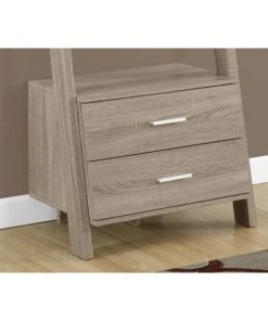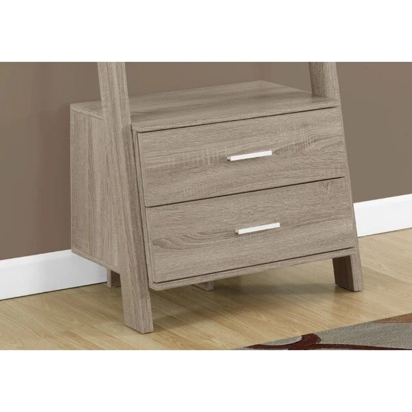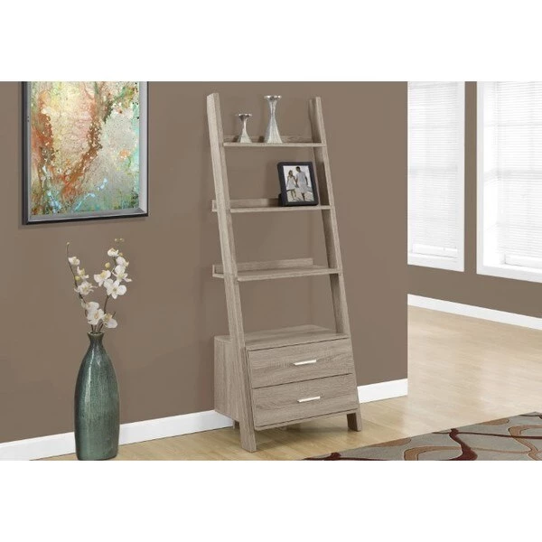 Adding a touch of modern style to your living space with this sophisticated etagere bookcase that includes tipping hardware for increased stability. The narrow ladder shelf format features four graduating open shelves and two convenient storage drawers equipped with sleek silver metal handles to add an extra pop of style to your home decor. These ladder shelves make the perfect spot to store books, plants, photo frames and other around home essentials. Its taupe finish gives it a stunningly unique appearance that is sure to grab the attention of your friends and family. . Sleek and sturdy contemporary taupe ladder bookcase fits perfectly in small homes, apartments or condos where space is limited. 2 storage drawers with silver metal handles for added style. 4 graduated open fixed book shelves accommodate books, decorations and other accent pieces. Ladder bookshelf includes tipping hardware for further stability.