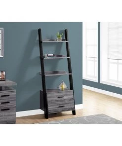 Adding a touch of modern style to your living space with this sophisticated etagere bookcase that includes tipping hardware for increased stability. The narrow ladder shelf format features four graduating open shelves and two convenient storage drawers equipped with sleek black metal handles to add an extra pop of style to your home decor. These ladder shelves make the perfect spot to store books, plants, photo frames and other around home essentials. Its black and grey finish gives it a stunningly unique appearance that is sure to grab the attention of your friends and family. . Sleek and sturdy contemporary black and grey ladder bookcase fits perfectly in small homes, apartments or condos where space is limited. 2 storage drawers with black metal handles for added style. 4 graduated open fixed book shelves accommodate books, decorations and other accent pieces. Ladder bookshelf includes tipping hardware for further stability.