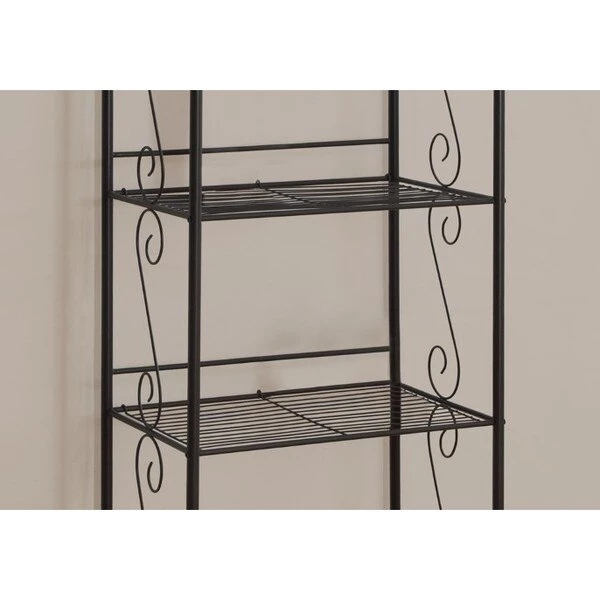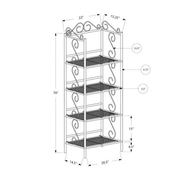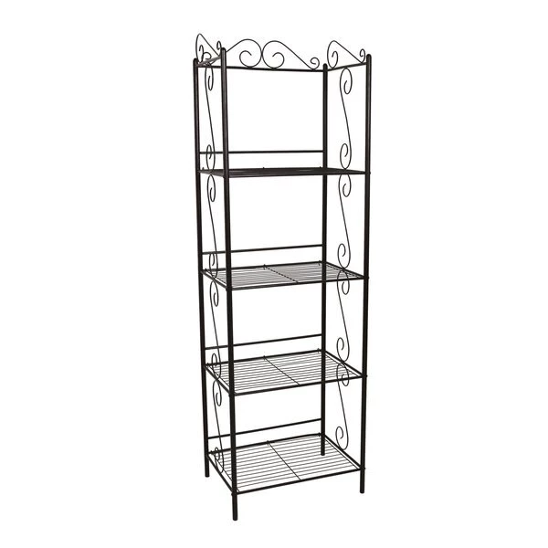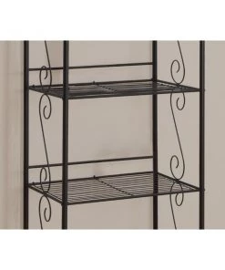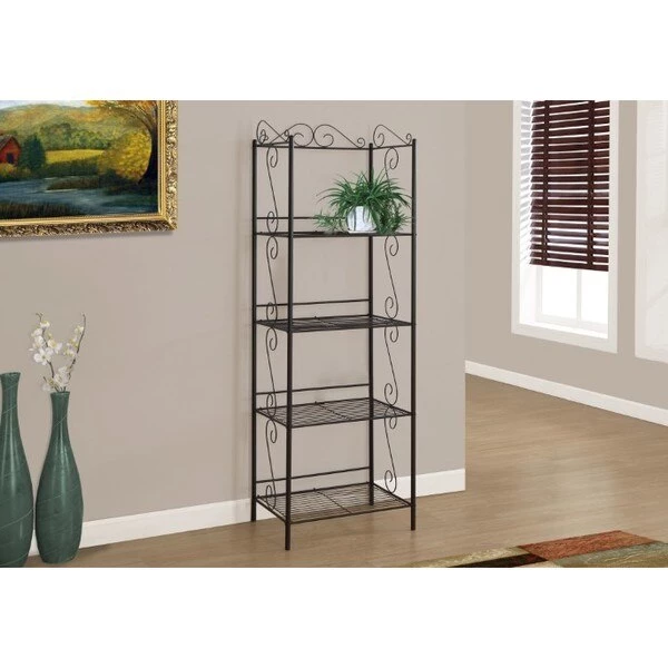 This elegant metal etagere/bookcase in a traditional style offers a distinctive storage solution that will blend in any room of your home. Featuring attractive scroll motifs on the side and along the top in copper metal, this etagere has four open shelves that offer an abundance of storage space for books, plants, pictures, candles and any other collectibles.. 4 open metal wire shelves in a copper tone ideal for storage or to display your favourite accents. Perfect accent shelf unit for hallways, bathrooms, kitchens. Attractive side and top scrolls in a dark copper toned metal. Traditional style makes it suitable for most decors.