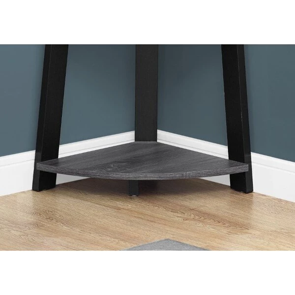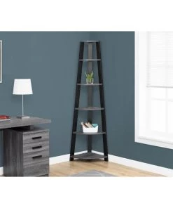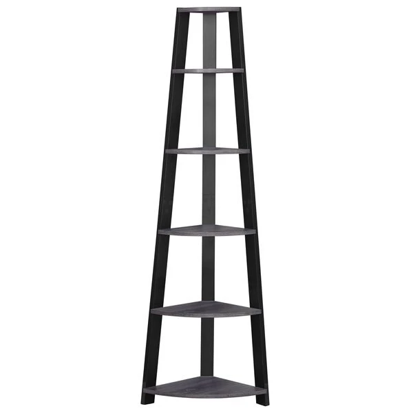 Set up this etagere bookcase easily and let it do its thing! Look how nice the grey and black wood look bookshelf fits in a corner of your living room, office or bedroom, allowing you to showcase books and all types of decor easily. Make use of a spot that is often tough to work with: the corner. Maximize storage and display with a modern piece that will be sure to help you utilize all the space available to you thanks to 5 fixed tray style shelves. Three sturdy beam legs ensure structural integrity to this corner ladder shelf. Anti-tipping hardware is included for further stability.. Maximize the space in a rather troublesome area: the corner, with this practical etagere bookcase . The bookshelf fits in the corner like a charm; 5 ladder shelves in a thick panel construction are perfect for books and other decor items . Trendy grey and black wood look color combination pairs effortlessly with any other style . Looks great in the living room, bedroom, home office or hallway; this corner bookcase boasts a sleek on-trend contemporary feel .