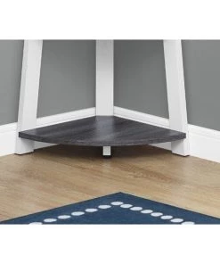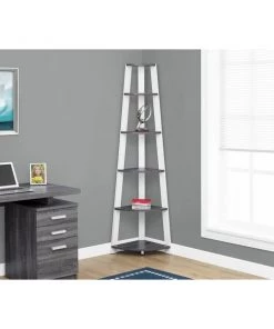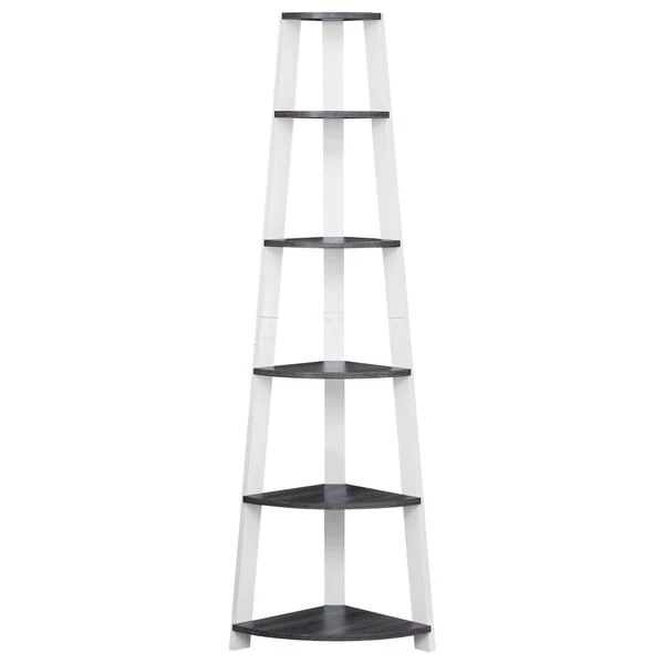 Set up this etagere bookcase easily and let it do its thing! Look how nice the grey and white bookshelf fits in a corner of your living room, office or bedroom, allowing you to showcase books and all types of decor easily. Make use of a spot that is often tough to work with: the corner. Maximize storage and display with a modern piece that will be sure to help you utilize all the space available to you thanks to 5 wood look fixed tray style shelves. Three sturdy white beam legs ensure structural integrity to this corner ladder shelf. Anti-tipping hardware is included for further stability.. Maximize the space in a rather troublesome area: the corner, with this practical etagere bookcase . The bookshelf fits in the corner like a charm; 5 grey wood look ladder shelves in a thick panel construction are perfect for books and other decor items . Trendy grey and white wood look color combination pairs effortlessly with any other style . Looks great in the living room, bedroom, home office or hallway; this corner bookcase boasts a sleek on-trend contemporary feel .
