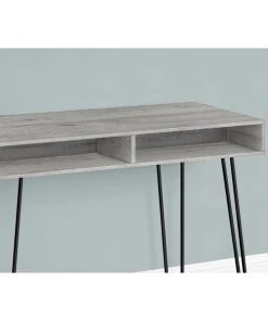 Bring mid-century style to your workspace with this computer desk with storage. This desk features a grey wood-look laminate finish paired with contrasting black metal hairpin legs for an elegant, retro style. The minimalistic design makes this writing desk a perfect addition to your dorm room or small apartment. The desktop is large enough for you to finish homework or browse social media on your laptop. The 2 open cubbies allow you to store notebooks, writing utensils, keeping your workspace clutter-free.