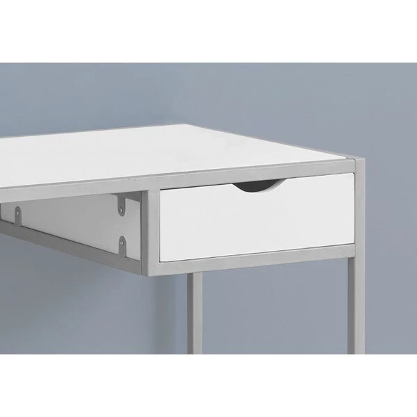 This computer desk with 1 storage drawer delivers stylish simplicity in a space-saving design. The desktop offers room for a laptop and the essentials you need to get work done. On the right, a storage drawer provides a convenient place to keep small supplies within easy reach. The drawer interior is finished in the same white laminate as the desktop panel and drawer exterior for a clean look. A slim yet sturdy metal frame in a silver finish outlines the desktop and storage drawer for a modern-industrial touch. The streamlined style of this compact writing table makes it a great choice if your home office space is in a living room or bedroom.. Computer desk with 1 small storage drawer featuring a comfortable cutout handle and metal drawer slides. Slender metal frame in a silver finish provides stability and contrasts the white laminate panels. Compact design and contemporary style ideal for smaller home offices. Assembly required: Illustrated instructions and all hardware are provided for convenience (additional tools may be needed).