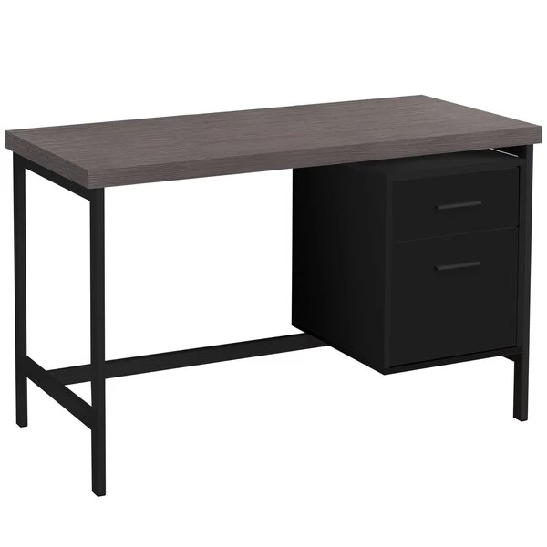 Sleek and contemporary, this black desk with a grey wood-look top, finished on all sides, is the perfect combination of function, durability and design in a modern form. With clean lines, a large, thick paneled surface and stylish silver metal legs, this piece will add pizzazz to any home office. Featuring a large storage drawer and a file drawer accented by black drawer pulls to help keep your office supplies and documents organized and desktop clutter free. This desk provides plenty of room to meet your working needs without compromising style making this a must have in any home office.