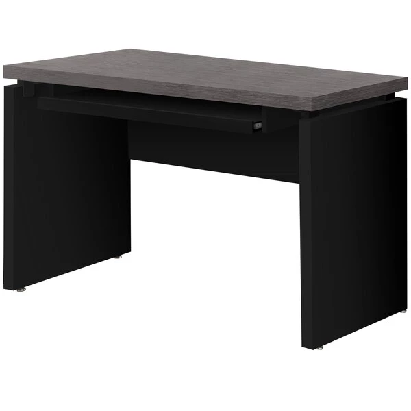 Ample surface area, leg room and sturdiness. This compact office desk has more than enough practicality to get your school work or business projects done. As a computer desk or writing station, this piece has an easy-glide large keyboard tray and a thick panel, spacious table top. Its wood look black and grey surface and a robust construction minimizes worries about sturdiness. For an upgrade in your small home, condo, apartment or dorm, here's your solution.