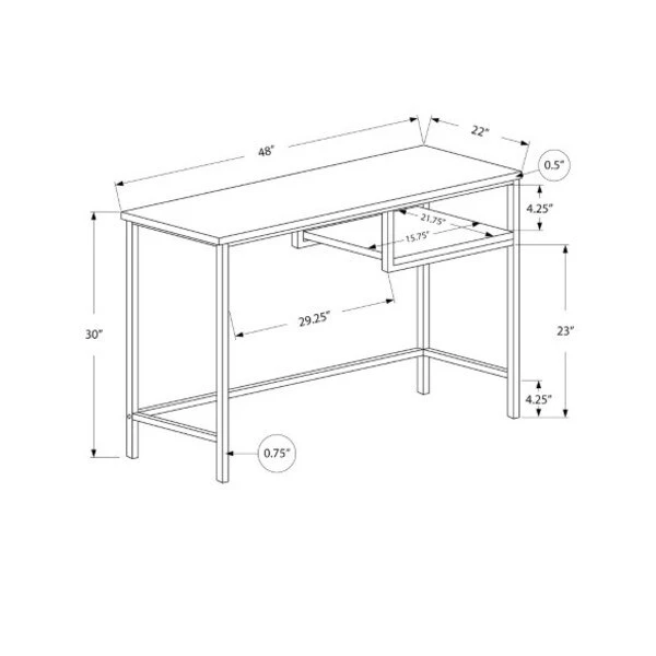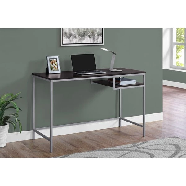 Simplicity with functionality is what you will find in this retro inspired, industrial style computer desk. The sleek espresso laminated top made from quality MDF material has ample space for your laptop, a lamp, some office supplies, with a suspended open shelf underneath to store books or paperwork. The sturdy silver metal base adds to the airy modern look making it ideal even for compact workspaces.. Spacious desk top in a chic espresso laminated finish. One open suspended cubby for additional storage. Sturdy coated silver metal legs. Modern industrial style in a compact design suitable in any work space.
