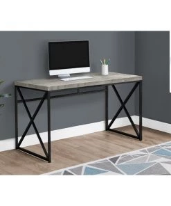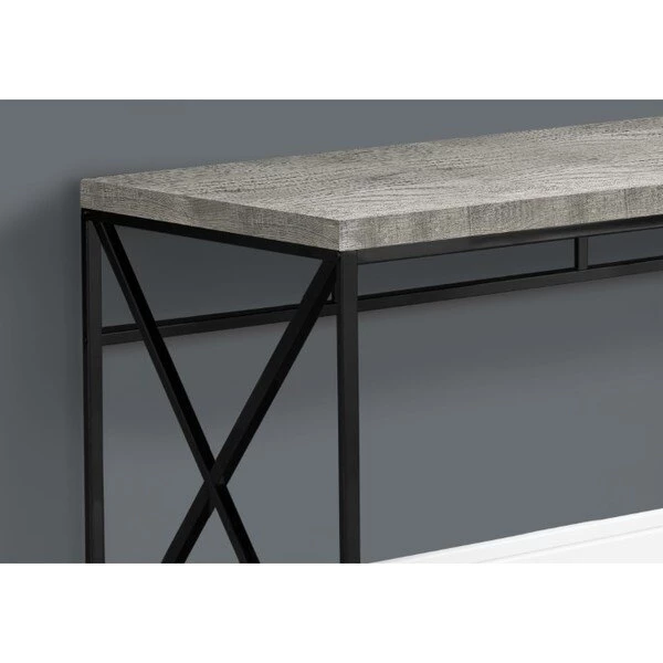 Space saving is a breeze with this compact desk that is sized for small homes, apartments or condos. Featuring a modern, wide open design, this desk finished in a grey reclaimed wood look is equally functional as a computer desk or writing table. A sturdy black metal X-design base ensures stability and offers lots of space to push in a chair. The thick panel top is perfect for a laptop/tablet, a lamp, a notebook and some important supplies to get the job done.. Perfect desk for all laptop or tablets; easy maintainable grey reclaimed wood look surface finished on all sides. Thick panel table top construction for a rustic wood look in the office space of your small home, apartment or condo. This office desk features a contemporary X-design black metal base that ensures sturdiness. For versatile use as a computer desk / writing table, this piece is perfect for limited spaces.