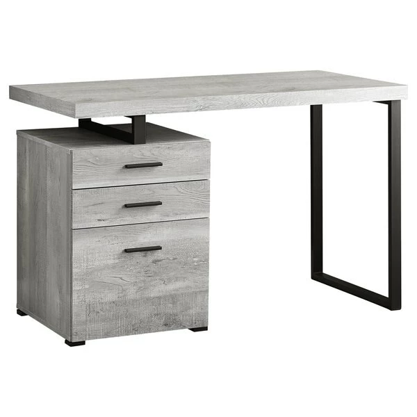 Maximize your home office space and your productivity with this computer desk with 3 storage drawers. The thick-panel floating desktop provides room for the essentials you need to work and allows you to use the top of the drawer unit as an extra surface. Finished in the same grey reclaimed wood-look laminate as the desktop, the drawer unit includes 2 small drawers and 1 large drawer with a bar for hanging files and offers space for items you want to keep off the work surface. The drawer unit is reversible and can be installed on the left or right side according to your preference. Supporting the desk is a metal leg in a black finish with a modern, stylish U shape.