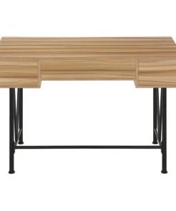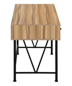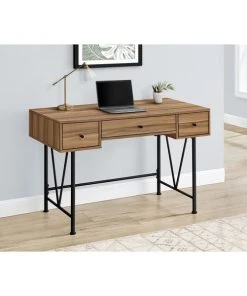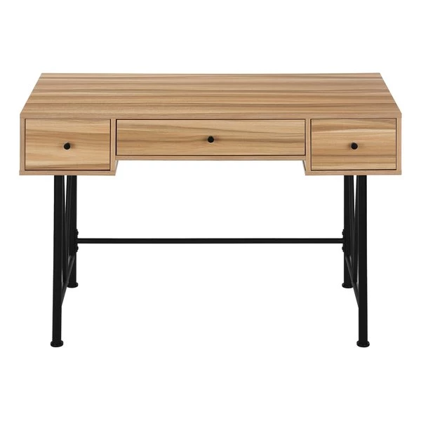 Industrial meets rustic charm in this highly functional contemporary designed computer desk. Accented with strong black metal legs with an inner V-shape design and providing plenty of storage that includes two side drawers with black metal pulls, and a wide middle drawer all on smooth metal glides. Finished on all sides in a light brown reclaimed wood-look finish, this writing desk can easily hold your computer, laptop, and other office essentials. This stylish computer desk will be a standout whether you place it in your living room, family room, or home office space.
