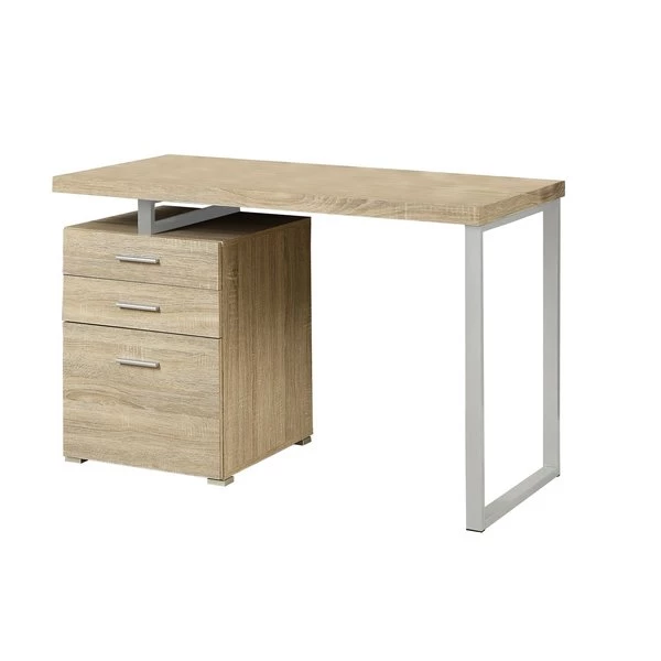 Maximize your home office space and your productivity with this computer desk with 3 storage drawers. The thick-panel floating desktop provides room for the essentials you need to work and allows you to use the top of the drawer unit as an extra surface. Finished in the same natural wood-look laminate as the desktop, the drawer unit includes 2 small drawers and 1 large drawer with a bar for hanging files and offers space for items you want to keep off the work surface. The drawer unit is reversible and can be installed on the left or right side according to your preference. Supporting the desk is a metal leg in a silver finish with a modern, stylish U shape.