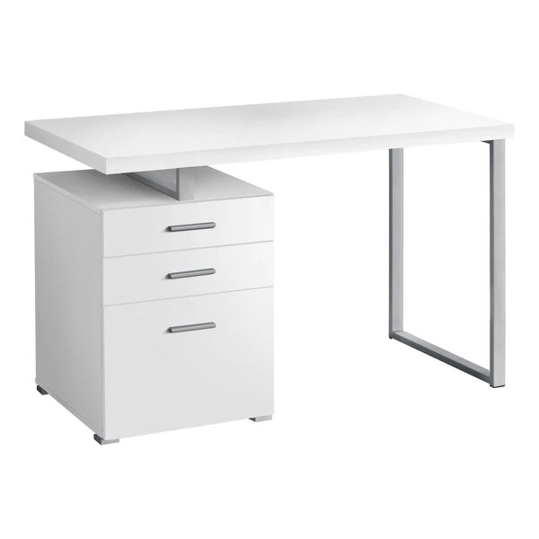 Maximize your home office space and your productivity with this computer desk with 3 storage drawers. The thick-panel floating desktop provides room for the essentials you need to work and allows you to use the top of the drawer unit as an extra surface. Finished in the same white laminate as the desktop, the drawer unit includes 2 small drawers and 1 large drawer with a bar for hanging files and offers space for items you want to keep off the work surface. The drawer unit is reversible and can be installed on the left or right side according to your preference. Supporting the desk is a metal leg in a silver finish with a modern, stylish U shape.