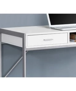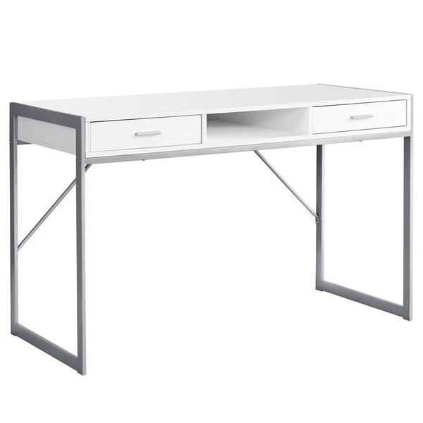 Combining function and style, this contemporary computer desk will be an instant standout in your home office. The spacious desktop with a sleek white finish on all sides with silver accents, includes two drawers to store away notepads, books, office supplies and an open concept middle shelf for papers will keep you neatly organized. Strong, square silver metal legs and frame support the desk for a chic modern statement. The space-saving design is an added bonus that can easily hold your laptop, a lamp, a picture or plant to round out your personal office space. Assembly is required.. Chic white finish with simple square silver metal base and frame. 2 spacious drawers for storage with sleek silver drawer handles. 1 open concept shelf for papers, books, notepads. Ample desk space for a laptop and other office essentials.