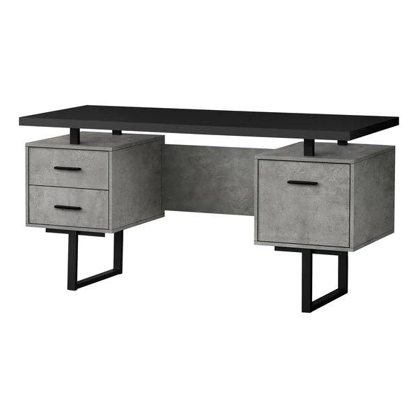 Feel like a boss in your home office when you sit down to work at this mid-size computer desk with 3 storage drawers. The thick-panel floating desktop in a black finish provides generous room for a laptop and writing materials, and allows you to use the tops of the drawer units as extra surfaces. Finished in a grey concrete-look laminate that contrasts the desktop, 2 small drawers and 1 large drawer with a bar for hanging files offer space for items you want to keep off the work surface. For flexibility, the drawer units are reversible and can be installed on either side according to your preference. Supporting the desk are metal legs in a black finish with a modern, stylish U shape.