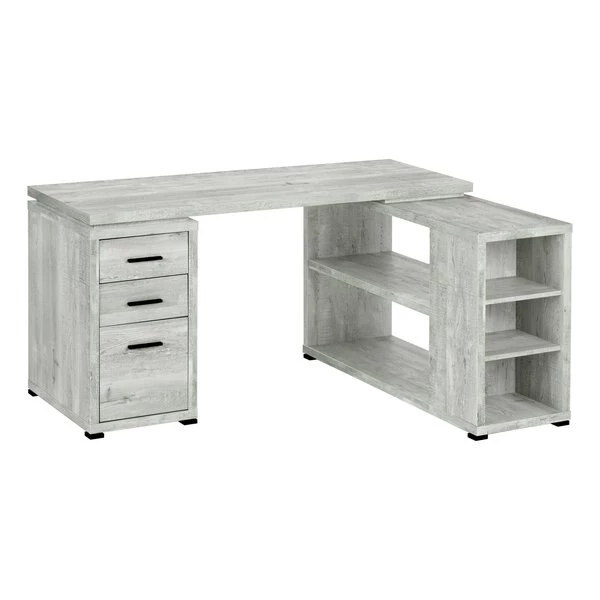 This corner desk combines functional storage space with elegant display areas. On the left is a filing cabinet with 3 storage drawers for storing small office supplies and letter- or legal-size files. On the right is a shelving unit with 2 open shelves that give the desk an airy feel and 3 cubbies that face forward, offering space for both books and decorative objects. Finished in a grey reclaimed wood-look laminate, this computer desk has a large desktop panel that overlaps the shelving unit to create a second, slightly lower worksurface. This L-shaped computer desk saves space when used in a corner but is finished on all sides for a polished look wherever it is placed in a home office.