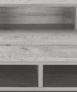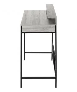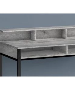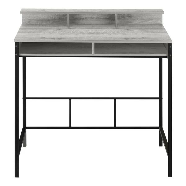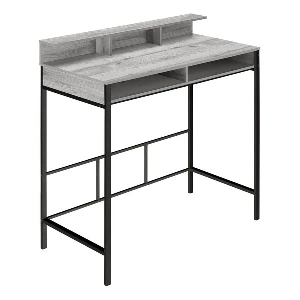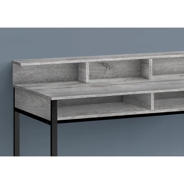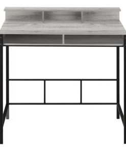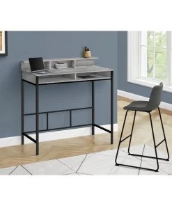 Make your computer desk work as hard as you do. This standing height computer workstation finished in grey wood-look is perfect for your extended workdays. With sleek black metal legs, 2 open shelves and hutch, it combines heightened style with maximum practicality to enhance your productivity. Pair it with our extremely comfortable standing height office chair (sold separately), to complete the look.