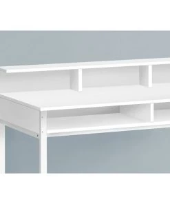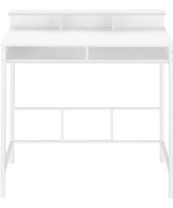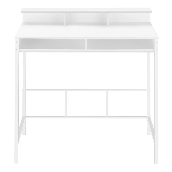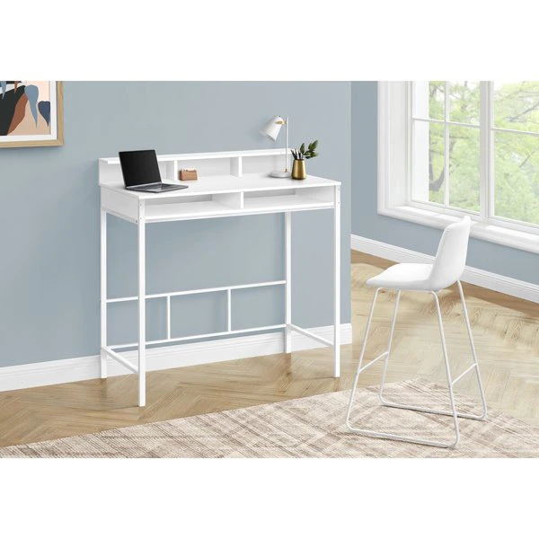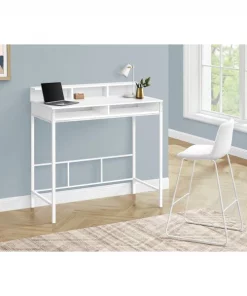 Make your computer desk work as hard as you do. This standing height computer workstation finished in white is perfect for your extended workdays. With sleek white metal legs, 2 open shelves and hutch, it combines heightened style with maximum practicality to enhance your productivity. Pair it with our extremely comfortable standing height office chair (sold separately), to complete the look.