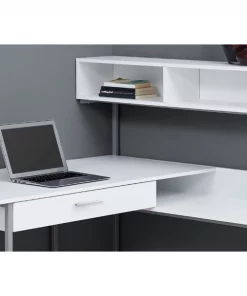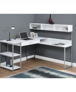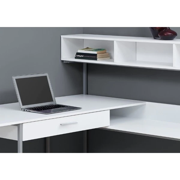Let this L-shaped corner desk / workstation inspire you with its practical and modern industrial aesthetic. It starts with a smooth laminate finish on all sides in a chic fresh white finish accented with strong silver metal framing. The numerous storage options include a wide drawer on metal glides with a sturdy silver handle alongside an open cubby, and two fixed bottom shelves for books, magazines or even a small printer. The side station is so useful with 3 spacious cubbies on top for all your work essentials. Assembly is required. Side station is not reversible.. Multi-functional computer workstation. Numerous storage options including 2 fixed shelves, spacious middle drawer on metal glides, 4 large open cubbies. Spacious desk tops for a computer and other work essentials. Strong and sturdy silver metal base.