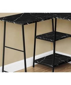 Make your corner computer desk work as hard as you do. This desk delivers style and functionality from top to bottom, starting with its spacious desktop in a smooth, black marble-look finish. Sawhorse-style legs in metal are put to work as supports for 2 open shelves that can be used to display books, small storage boxes, or other items. This unique L-shaped writing desks' compact design and industrial style maximizes space and storage potential so that you can maximize productivity.