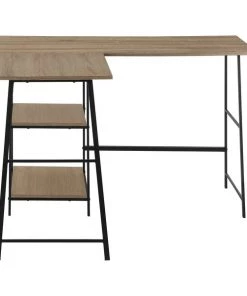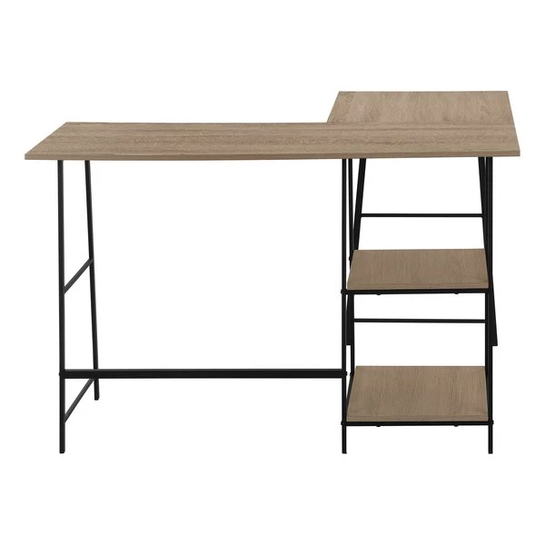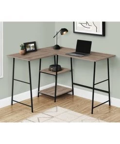 Make your corner computer desk work as hard as you do. This desk delivers style and functionality from top to bottom, starting with its spacious desktop in a smooth, dark taupe finish. Sawhorse-style legs in metal are put to work as supports for 2 open shelves that can be used to display books, small storage boxes, or other items. This unique L-shaped writing desks' compact design and industrial style maximizes space and storage potential so that you can maximize productivity.