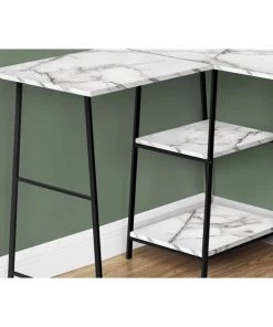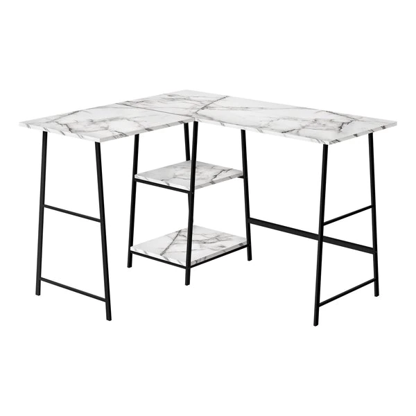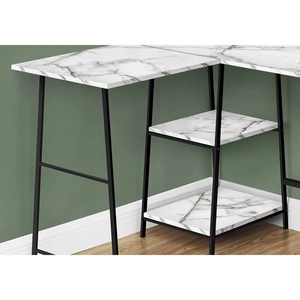 Make your corner computer desk work as hard as you do. This desk delivers style and functionality from top to bottom, starting with its spacious desktop in a smooth, white marble-look finish. Sawhorse-style legs in metal are put to work as supports for 2 open shelves that can be used to display books, small storage boxes, or other items. This unique L-shaped writing desks' compact design and industrial style maximizes space and storage potential so that you can maximize productivity.