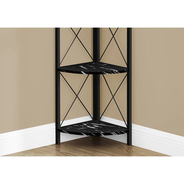 Perfect for photo frames, plants, other decorative items and even kitchen accessories, this transitional-style corner bookcase will upgrade your decor. Including 4 black marble-look display shelves, this corner display unit features a three-leg black metal frame and a X-Design to add modern flare wherever you choose to place it. This corner etagere bookcase is sure to impress. Assembly is required.