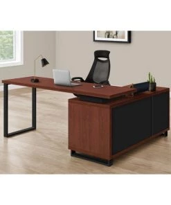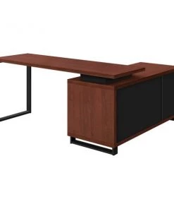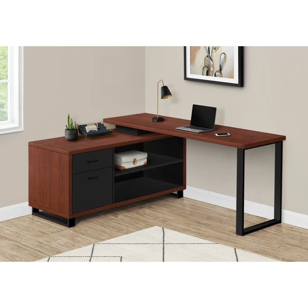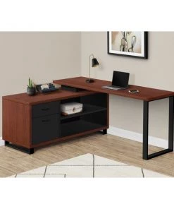 This stunning executive L-shaped desk will add style to any office space. Finished in cherry wood-look it boasts two storage drawers and two open shelves finished in black which serve to accentuate its modern and minimalist design. The two-tiered work top provides a large work area and ample space to store your office essentials, and a solid black metal leg provides a stable base. The perfect computer desk for your home office, this spacious workstation elegantly combines a two-tone finish that your friends and colleagues will admire. Staying organized at home has never been so easy and fashionable!