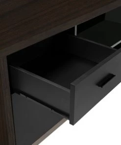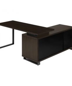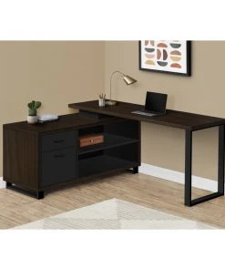 This stunning executive L-shaped desk will add style to any office space. Finished in dark brown espresso it boasts two storage drawers and two open shelves finished in black which serve to accentuate its modern and minimalist design. The two-tiered work top provides a large work area and ample space to store your office essentials, and a solid black metal leg provides a stable base. The perfect computer desk for your home office, this spacious workstation elegantly combines a two-tone finish that your friends and colleagues will admire. Staying organized at home has never been so easy and fashionable!