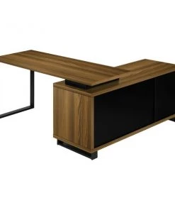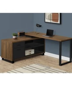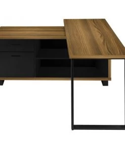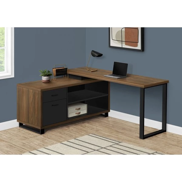This stunning executive L-shaped desk will add style to any office space. Finished in walnut wood-look it boasts two storage drawers and two open shelves finished in black which serve to accentuate its modern and minimalist design. The two-tiered work top provides a large work area and ample space to store your office essentials, and a solid black metal leg provides a stable base. The perfect computer desk for your home office, this spacious workstation elegantly combines a two-tone finish that your friends and colleagues will admire. Staying organized at home has never been so easy and fashionable!
