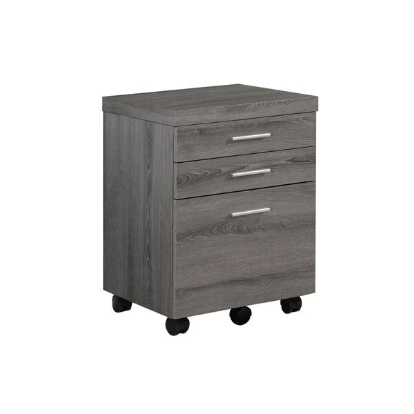 Complete your workstation with this compact and functional mobile file cabinet finished in a wood look. Easy on the eyes, it can be placed anywhere thanks to 5 casters (2 locking) to complete your collection with matching office desks (sold separately). Also useful as a printer stand, this filing cabinet is there for you to help you reach your potential no matter the task at hand. Two convenient letter sized drawers easily accommodate files, papers, letters or books, while the third and bottom drawer handles legal sized documents so that you have multiple convenient storage options. Accented with simple modern silver colored handles, this unit has no lack of style.