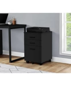 Complete your workstation with this compact and functional mobile file cabinet with a black laminate finish. Easy on the eyes, it can be placed anywhere thanks to 5 casters (2 locking), and you can complete your collection with a matching office desk (sold separately). Also useful as a printer stand, this filing cabinet is there for you to help you reach your potential no matter the task at hand. Two convenient letter sized drawers easily accommodate files, papers, letters, or books, while the third and bottom drawer handles legal sized documents so that you have multiple convenient storage options. Accented with simple modern black colored handles, this unit has no lack of style.