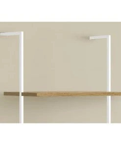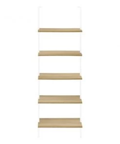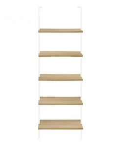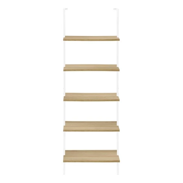 This charming and minimalist ladder bookcase is a great way to bring modern style to your decor. It is crafted with an open white metal frame that mounts to the wall to keep it in place. Five tier ample shelving made from engineered wood in a natural wood look finish and provide the perfect place for books, plants, bar essentials, or anything else you want to display. Mount this tall and narrow space-saving bookshelf to the wall in your home office, living room, or bedroom.