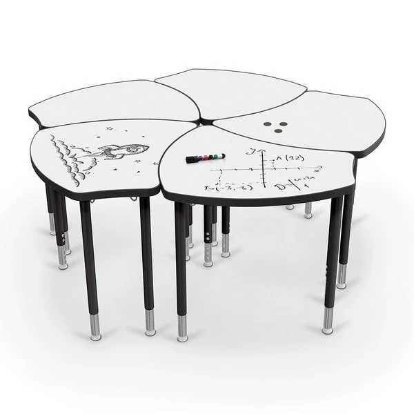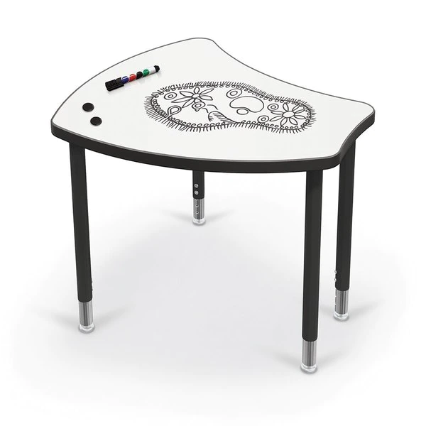 Only from MooreCo! Hierarchy Shapes Desk is now available with an innovative and superior porcelain steel top.Hierarchy Shapes Desk brings simplicity and functionality in a customizable package made to fit any classroom or study setting. Offering quick and easy assembly, numerous group configurations, height adjustability, and custom laminates. Now available with a porcelain steel whiteboard top, designed to provide space for doodling, jotting down notes and ideas, and brainstorming. Surface accepts magnets for even more versatility. Porcelain reduces ambient reflection and glare over standard markerboard, providing a more comfortable to use writing surface. Porcelain also has superior erasability, and comes with a lifetime guarantee. Tests show porcelain is 2.5 times harder and twice as scratch-resistant as laminate, reducing dents, dings, and other damage. Surface is also 5.5 times more wear-resistant. Erasability is 2.5 times better on a porcelain surface versus laminate dry erase surface when both surfaces are new, and holds up to use, showing five times better erasability over time. Porcelain top is also resistant to delamination, keeping dry erasability intact for the life of the desk. Porcelain steel top comes with molded polypropylene edgebanding in black only. Edge is slightly raised for a fully encapsulated top, ensuring steel will not rust. Steel is extra thick 24-gauge to protect against denting and damage. Powder coated steel legs are height adjustable and are available in black or platinum. Legs include floor safe glides, or choose optional casters for easy pod configuration. SCS Indoor Advantage Gold Certifi