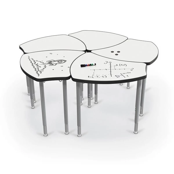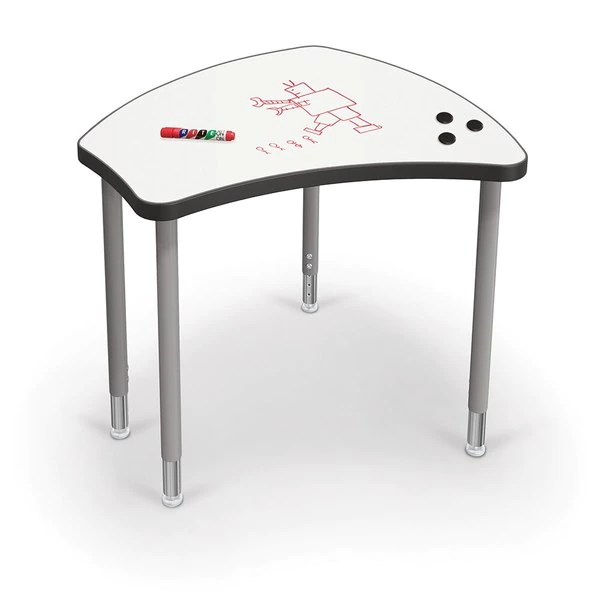 Only from MooreCo! Hierarchy Shapes Desk is now available with an innovative and superior porcelain steel top.Hierarchy Shapes Desk brings simplicity and functionality in a customizable package made to fit any classroom or study setting. Offering quick and easy assembly, numerous group configurations, height adjustability, and custom laminates. Now available with a porcelain steel whiteboard top, designed to provide space for doodling, jotting down notes and ideas, and brainstorming. Surface accepts magnets for even more versatility. Porcelain reduces ambient reflection and glare over standard markerboard, providing a more comfortable to use writing surface. Porcelain also has superior erasability, and comes with a lifetime guarantee. Tests show porcelain is 2.5 times harder and twice as scratch-resistant as laminate, reducing dents, dings, and other damage. Surface is also 5.5 times more wear-resistant. Erasability is 2.5 times better on a porcelain surface versus laminate dry erase surface when both surfaces are new, and holds up to use, showing five times better erasability over time. Porcelain top is also resistant to delamination, keeping dry erasability intact for the life of the desk. Porcelain steel top comes with molded polypropylene edgebanding in black only. Edge is slightly raised for a fully encapsulated top, ensuring steel will not rust. Steel is extra thick 24-gauge to protect against denting and damage. Powder coated steel legs are height adjustable and are available in black or platinum. Legs include floor safe glides, or choose optional casters for easy pod configuration. SCS Indoor Advantage Gold Certifi