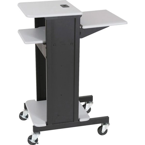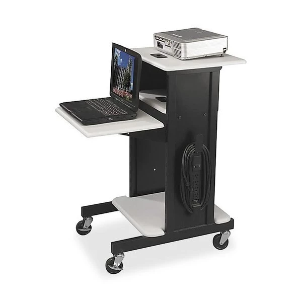 Presentation cart holds all equipment on three sturdy shelves that adjust in 1-1/4" increments. Handy unit moves on heavy-duty 3" casters (two locking) for easier movement between rooms. Grommets keep cables managed between shelves. Top shelf measures 18" wide x 16" deep. Laptop shelf measures 18" wide x 14" deep, and bottom shelf measures 18" wide x 18" deep. Optional electrical assembly (sold separately) includes four UL-CSA approved outlets, 25' cord and cord winder. Tops are gray, and the frame is black.