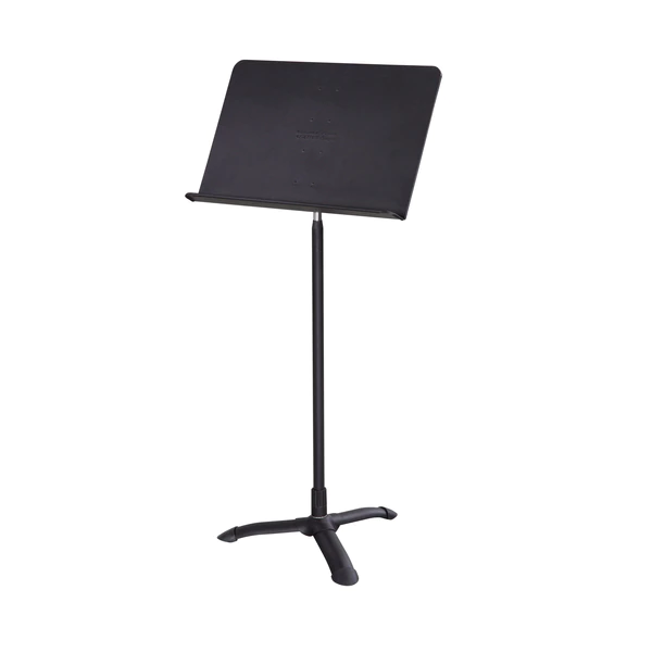The 82MS Music Stand will keep sheet music or lecture notes displayed at the height of your choice. The durable 22-gauge aluminum surface is a spacious 20 1/2" wide and features safe rolled edges to prevent harm to instruments or people. A black textured finish resists chips and scratches so your music stand looks good-as-new year after year. To fit any user's need, adjust the desk angle and height from 24" to 46" (from bookrest lip to floor) with the spring-loaded tube.