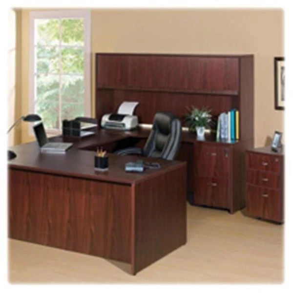 Office furniture offers a high-quality laminate construction with metal to metal cam lock connections. Design includes 3mm PVC edges and adjustable floor guides. Furniture has predrilled holes with metal inserts for easy attachment by screws of pedestals. Brackets are designed for L-shape configurations and bridge returns.