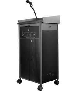 The Greystone Lectern with sound and Wireless Handheld Mic from Oklahoma Sound is far more than just a basic lectern. This elegantly designed unit offers an all-in-one presentation experience. Large reading surface (22.75”W x 18.25”D), two side pull-out shelves (14.25”W x 12”D), and a sliding keyboard tray (17.5”W x 9.25”D) provides for a complete multi-media presentation experience. Designer curved grey plywood adds a sophisticated look. The cabinet includes three large shelves plus an oversized front drawer for ample storage. 2.5” hooded twin wheel matching casters makes for easy mobility. Elegance & functionality for all your presentation needs. This model operates with a rechargeable battery.