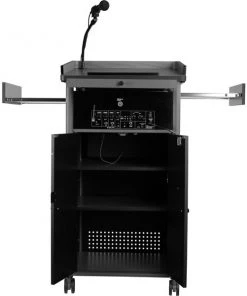 The Greystone Lectern with sound and Wireless Headset Mic from Oklahoma Sound is far more than just a basic lectern. This elegantly designed unit offers an all-in-one presentation experience. Large reading surface (22.75”W x 18.25”D), two side pull-out shelves (14.25”W x 12”D), and a sliding keyboard tray (17.5”W x 9.25”D) provides for a complete multi-media presentation experience. Designer curved grey plywood adds a sophisticated look. The cabinet includes three large shelves plus an oversized front drawer for ample storage. 2.5” hooded twin wheel matching casters makes for easy mobility. Elegance & functionality for all your presentation needs. This model operates with a rechargeable battery.
