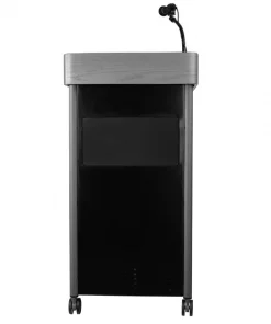 The Greystone Lectern with sound and Wireless Handheld Mic from Oklahoma Sound is far more than just a basic lectern. This elegantly designed unit offers an all-in-one presentation experience. Large reading surface (22.75”W x 18.25”D), two side pull-out shelves (14.25”W x 12”D), and a sliding keyboard tray (17.5”W x 9.25”D) provides for a complete multi-media presentation experience. Designer curved grey plywood adds a sophisticated look. The cabinet includes three large shelves plus an oversized front drawer for ample storage. 2.5” hooded twin wheel matching casters makes for easy mobility. Elegance & functionality for all your presentation needs.
