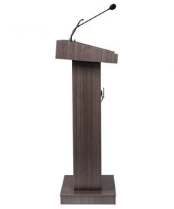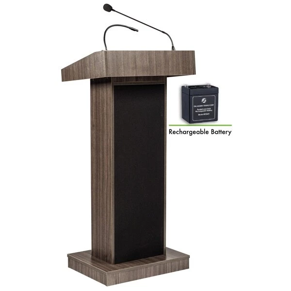 Meet your new versatile lectern! The Model #800X Orator is a functional and modern 40-watt sound lectern with a standing height of 46 inches, suitable for every speaker and environment. Enjoy a spacious reading surface illuminated by an updated black halogen lamp and a digital timepiece for monitoring speech duration. An ample 12" x 4" shelf space provides convenient and elegant storage, while the lectern’s four concealed easy-roll casters ensure smooth mobility. The Orator offers a wide range of multimedia options, including an updated 21” built-in gooseneck microphone, a tie-clip/lapel mic with 10' cable, and an amplifier that works with other OS optional wireless microphones. The unit also features an upgraded amplifier with Bluetooth/USB inputs. The Orator Lectern provides practical functionality and a premium finish to ensure successful multimedia presentations in conference rooms, meeting halls, auditoriums, cafeterias, and beyond.
