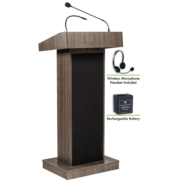 Meet your new versatile lectern! The Model #800X Orator is a functional and modern 40-watt sound lectern with a standing height of 46 inches, suitable for every speaker and environment. Enjoy a spacious reading surface illuminated by an updated black halogen lamp and a digital timepiece for monitoring speech duration. An ample 12" x 4" shelf space provides convenient and elegant storage, while the lectern’s four concealed easy-roll casters ensure smooth mobility. The Orator offers a wide range of multimedia options, including an updated 21” built-in gooseneck microphone, a tie-clip/lapel mic with 10' cable, and an amplifier that works with other OS optional wireless microphones. The unit also features an upgraded amplifier with Bluetooth/USB inputs. The Orator Lectern provides practical functionality and a premium finish to ensure successful multimedia presentations in conference rooms, meeting halls, auditoriums, cafeterias, and beyond.