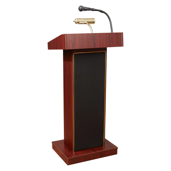 The Model #800X Orator is a versatile, 40-watt sound lectern, suitable for medium-sized venues like conference rooms, meeting halls, auditoriums and cafeterias. It offers a spacious reading surface illuminated by an attractive brass lamp. A surface-mounted digital timepiece is included for monitoring speech duration. An ample 12" x 4" shelf space provides convenient storage.