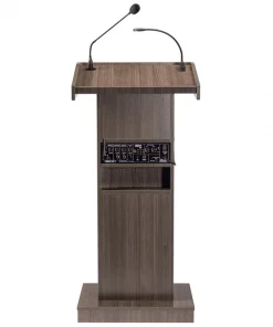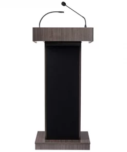 Meet your new versatile lectern! The Model #800X Orator is a functional and modern 40-watt sound lectern with a standing height of 46 inches, suitable for every speaker and environment. Enjoy a spacious reading surface illuminated by an updated black halogen lamp and a digital timepiece for monitoring speech duration. An ample 12" x 4" shelf space provides convenient and elegant storage, while the lectern’s four concealed easy-roll casters ensure smooth mobility. The Orator offers a wide range of multimedia options, including an updated 21” built-in gooseneck microphone, a tie-clip/lapel mic with 10' cable, and an amplifier that works with other OS optional wireless microphones. The unit also features an upgraded amplifier with Bluetooth/USB inputs. The Orator Lectern provides practical functionality and a premium finish to ensure successful multimedia presentations in conference rooms, meeting halls, auditoriums, cafeterias, and beyond.