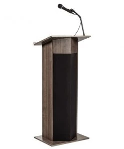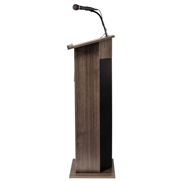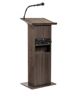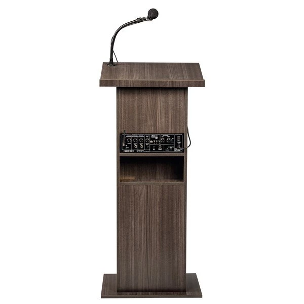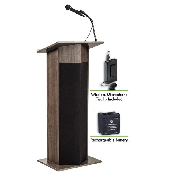 The Power Plus Lectern with Wireless Tie clip/ lavalier mic is attractive, affordable and proven as a bestselling OS sound lectern. Its 30-watt amp is ideal for venues like smaller conference rooms, meeting halls, auditoriums and cafeterias. Large 20.5" wide by 6" deep shelf space provides convenient storage. The unit includes a handheld mic with 9' cable and a factory-installed gooseneck mic holder, a tie-clip/lapel mic with 10' cable, a wireless tie clip/lavalier mic and an amplifier that works with OS wireless microphones. Multimedia capabilities include simultaneous usage with two wired and one wireless microphones. It operates either by AC plug or with included battery model PS12-V and features input jacks for CD players, extension speakers, recording outputs and playing MP3s. Ships fully assembled.