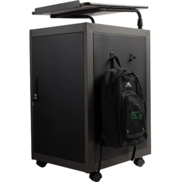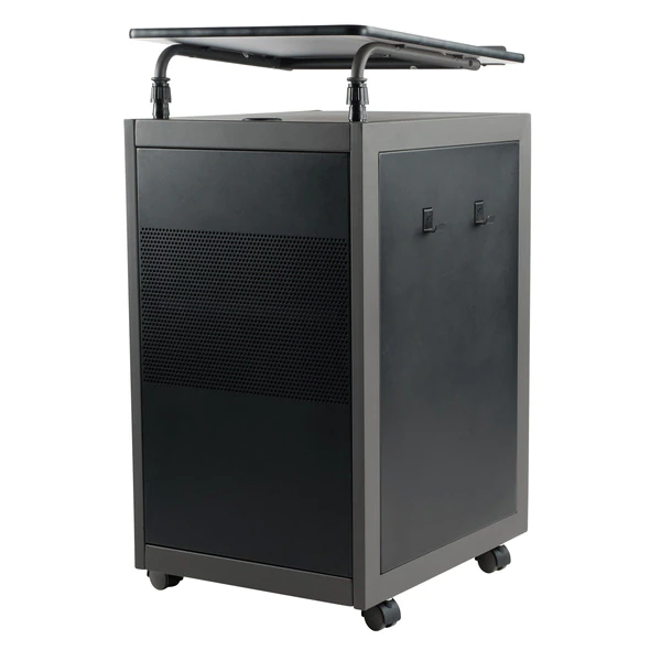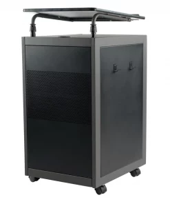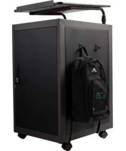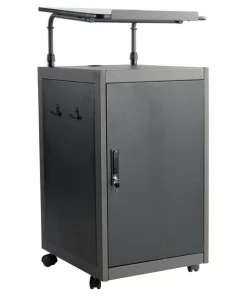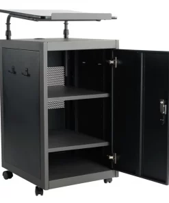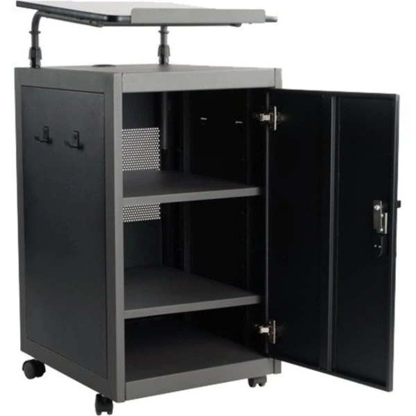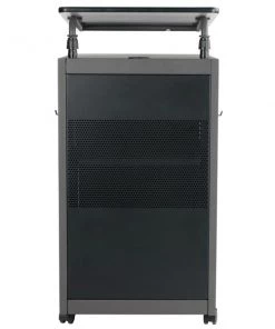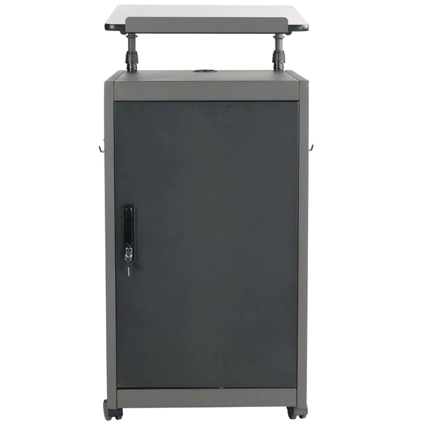The Teacher’s WorkPod Desk and Lectern from Oklahoma Sound offers you both a Desk and Lectern to be used together or as separate standalone units. The WorkPod includes an attractive Charcoal Slate and Black steel Lectern. The grey nebula reading surface with metal book stop can be set to your personal comfort zone and height requirement. Store all your supplies in the locking storage cabinet with adjustable height shelves. Wire management grommets on Lectern cabinet allow for use of technology equipment such as projectors, laptops or tablets, and built-in attractive mesh front provides venting to prevent overheating. The 24”W x 48”L WorkPod Desktop is made from heavy-duty plastic blow mold with extra framing underneath for heavy duty use. The desktop can be mounted on either side of the Lectern on a contemporary frame and leg system with modesty panel. 2” double-wheel hooded casters offer you an ultra-durable and mobile unit. So sit or stand, lecture as you see fit… the choice is yours!